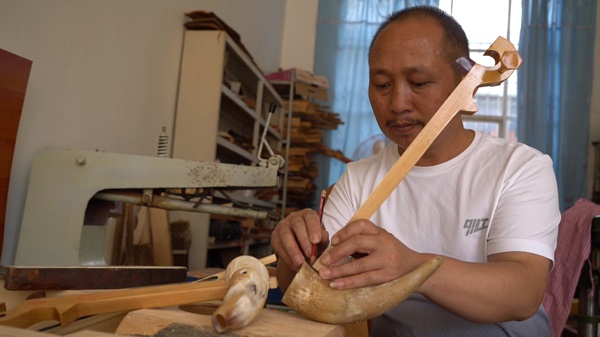 “我从12岁就跟着我父亲学做三弦、四弦、二胡这些彝族乐器,小时候,我每天早晨起床就跟着父亲开始学做这些乐器,在一旁边看边学,然后就慢慢地开始自己做了。”张正昌说。