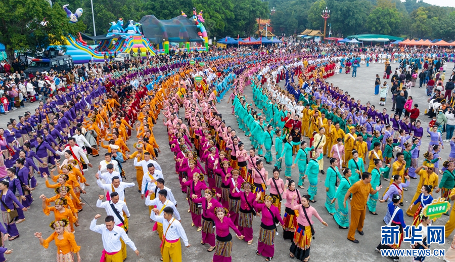 12月17日,“大美陇川”傣历新年庆典活动在云南省德宏傣族景颇族自治州陇川县民族文化广场举行。身着传统服饰的傣族群众齐聚广场,随着节奏明快的鼓点,跳起了傣族传统集体舞蹈“嘎伴光”,现场成为一片欢乐的海洋。