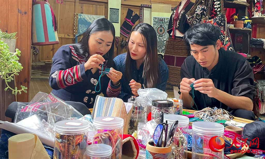 佤族织锦非遗工坊内员工向参观者讲解香包制作技艺。旦正吉 摄