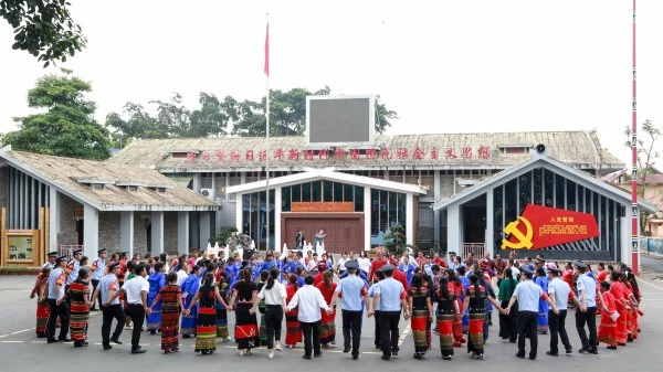 将铸牢中华民族共同体意识融入村规民约,将民族事务治理纳入基层网格服务清单,不断提升民族事务治理现代化水平。把边境界碑、边防联防所打造为党性教育、爱国主义教育实训基地,增进各族群众对“四个都有”“五个共同”的认同。推行国门教育帮带、国门医疗共享、国门文化共创、边境联防共管,守护好境内外佤族同胞同宗同族的胞波情谊。依托“自然村长”构建基层共建共治共享新格局,打造“聂唠喽勐”民族特色调解室,召开“院坝协商”议事会议,把民族团结“六个相互”工作做到家家户户。依托“佤山前哨”“月亮之家”等群防群治队伍,不断健全党政军警民“五位一体”强边固防机制,发动各族群众积极参与到边境地区综合治理中来。