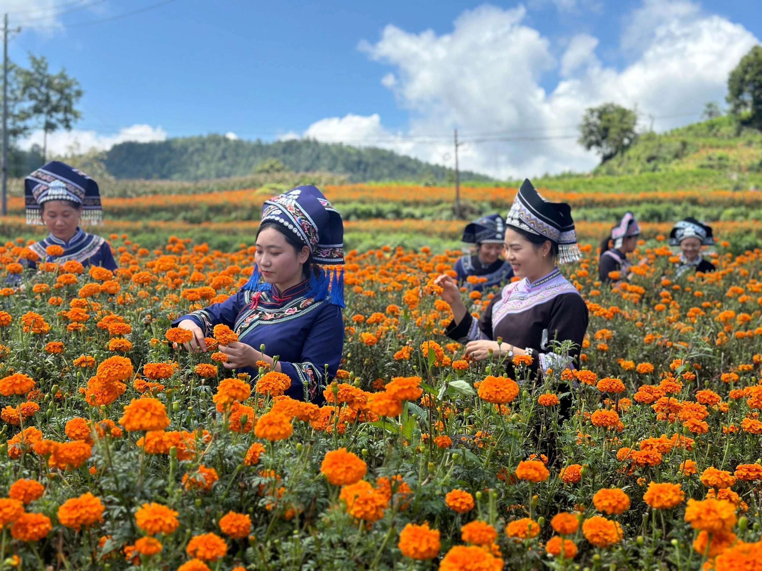 走进田蓬镇龙哈村,千亩万寿菊迎风绽放,花农们穿梭花丛中采摘、装筐,笑容映着花海格外灿烂。依托“党支部+公司+农户”的合作机制,田蓬镇引进云南谊乾生物科技有限公司,规模化发展万寿菊种植1000亩。预计今年万寿菊产量超2000吨,产值突破100万元,直接带动300余名群众就近务工,户均年增收8000元以上,让“金色产业”成为群众增收的新引擎。