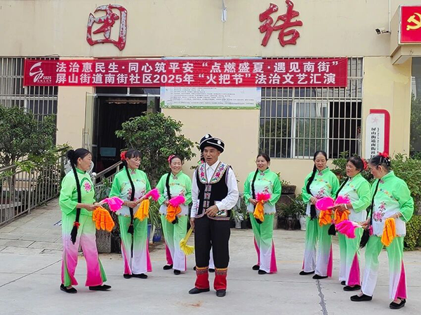 彝族火把节期间,禄劝屏山司法所联合街道社会事务办、平安法治办等部门,走进社区为居民带来治文艺汇演。屏山司法所 供图