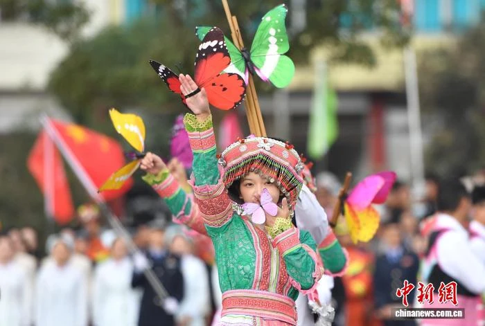 12月7日,巡游人员手拿蝴蝶道具进行表演。黄兴鸿 摄