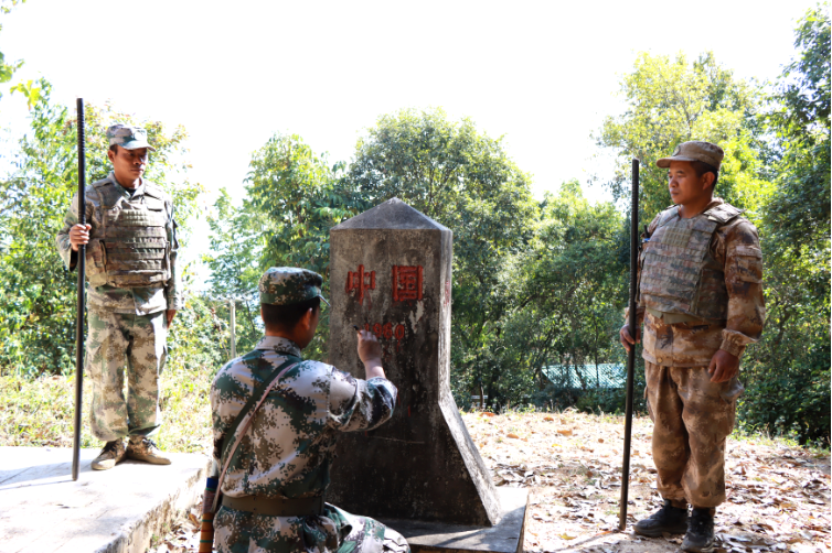 新春之际,联防员肖赛远为界碑描红