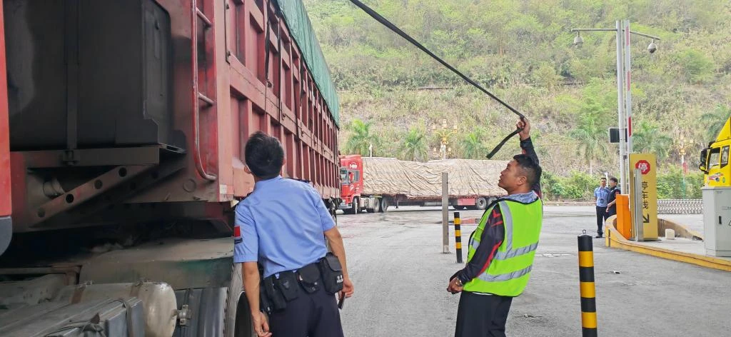 河口出入境边防检查站民警正在仔细检查货车。新华社记者 浦超 摄
