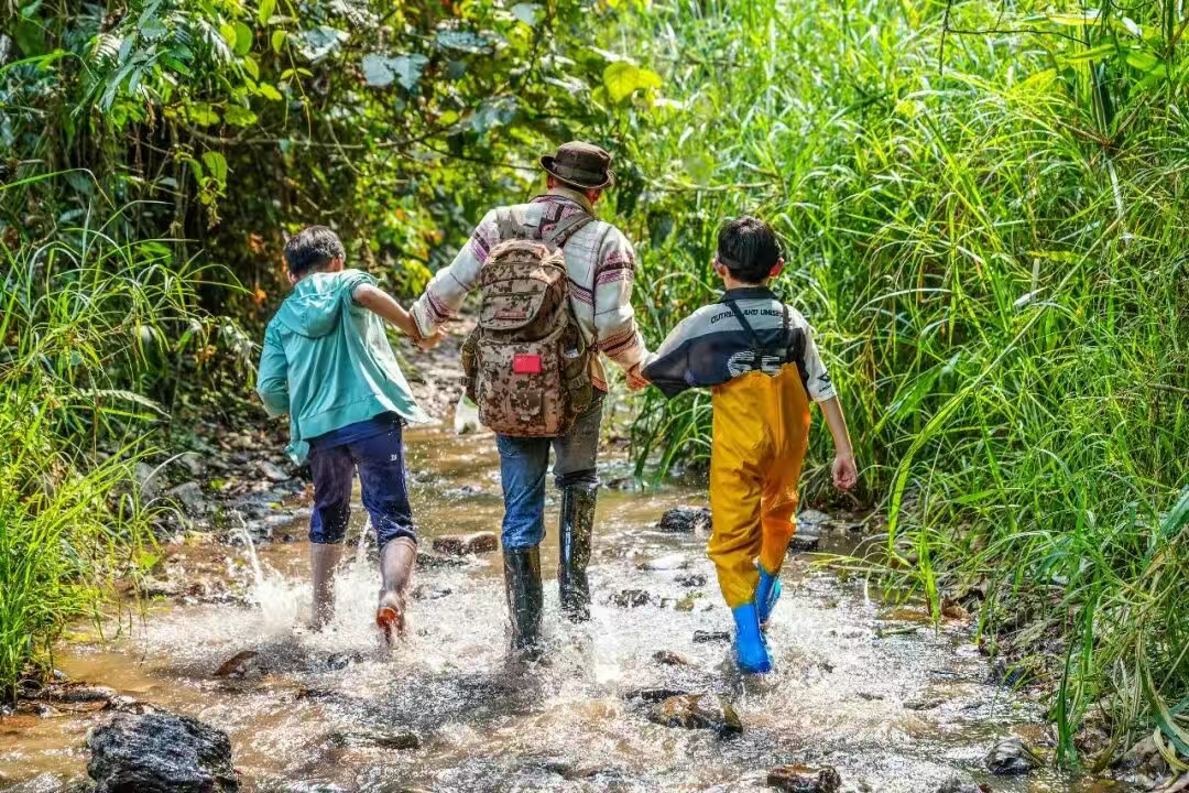 景洪市基诺山乡巴朵村当地向导带领小朋友体验热带雨林徒步项目。(郝亚鑫 摄)