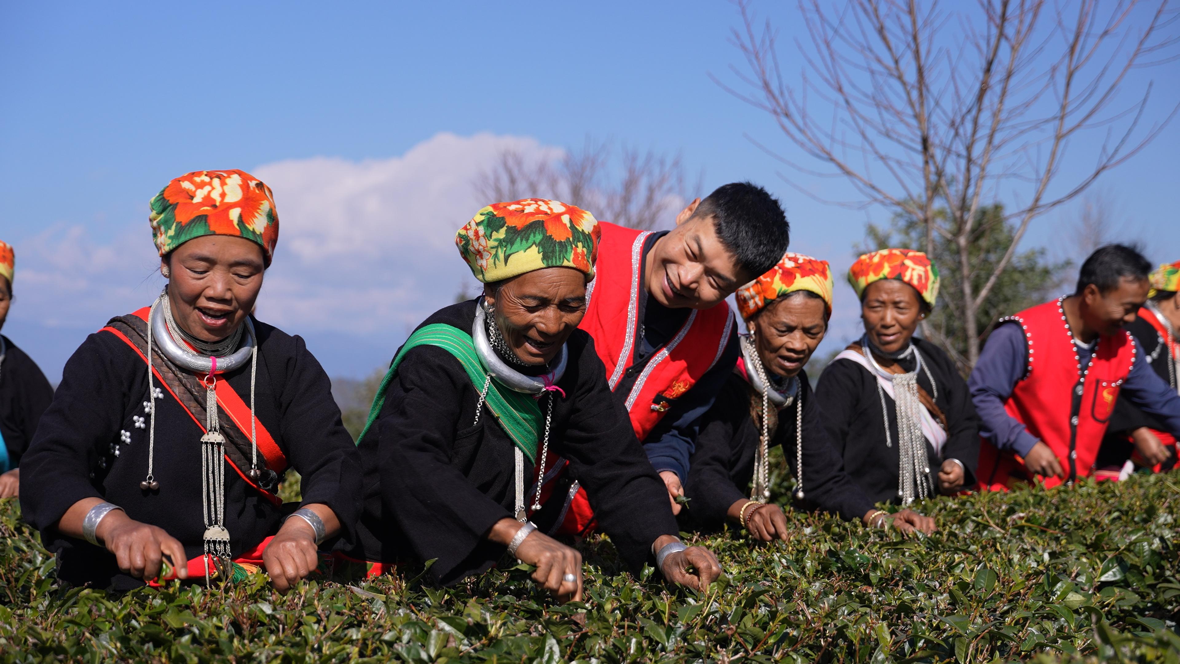 沧源佤族自治县糯良乡贺岭村“自然村长”刘圣伟与茶农一起采茶