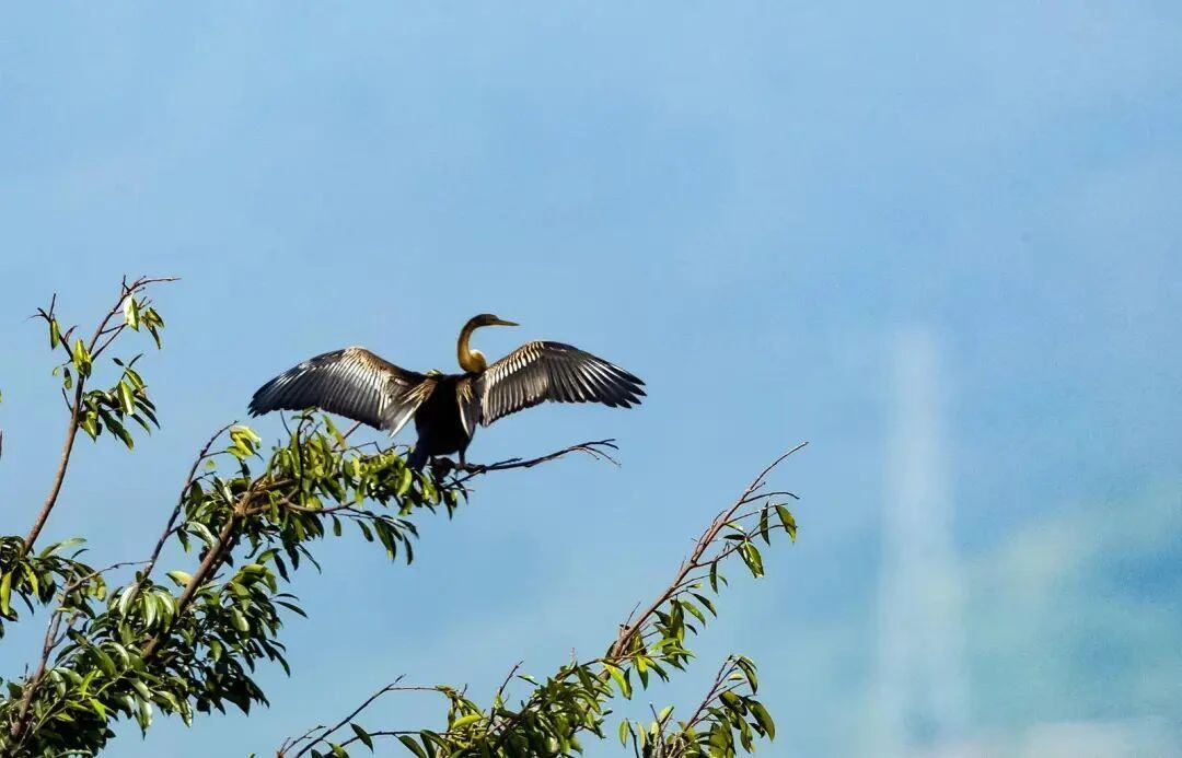 黑腹蛇鹈俗称“蛇鸟”,体长约84厘米,颈细如蛇、喙尖似矛,擅长潜水捕鱼,对水质、湿地生态系统要求极高,被列入《世界自然保护联盟濒危物种红色名录》近危物种。该物种1931年在我国有过记录后,曾销声匿迹近百年,2021年首次在瑞丽弄莫湖被重新观测到,此后连年现身,印证瑞丽已成为其稳定栖息与迁徙停歇的优选之地。