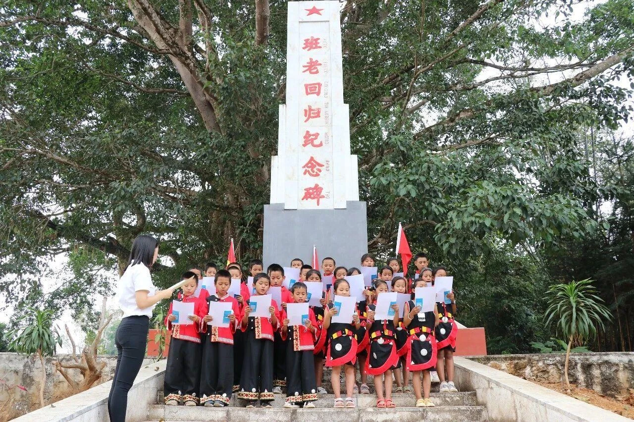 ❖班老小学组织学生在班老回归纪念碑下进行爱国主义教育。