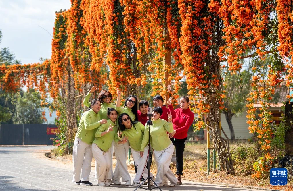 游客在炮仗花下打卡 图源:新华社