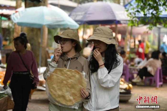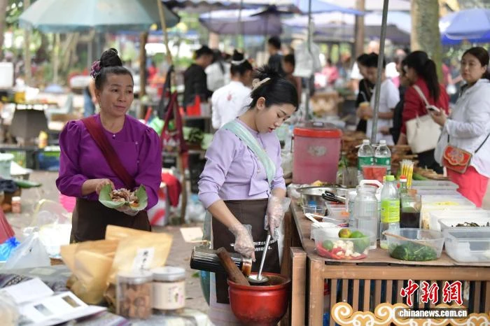 3月14日,游客在云南省西双版纳傣族自治州勐腊县曼龙勒古傣寨赶摆场品尝美食、体验当地民俗文化。段开勇 摄